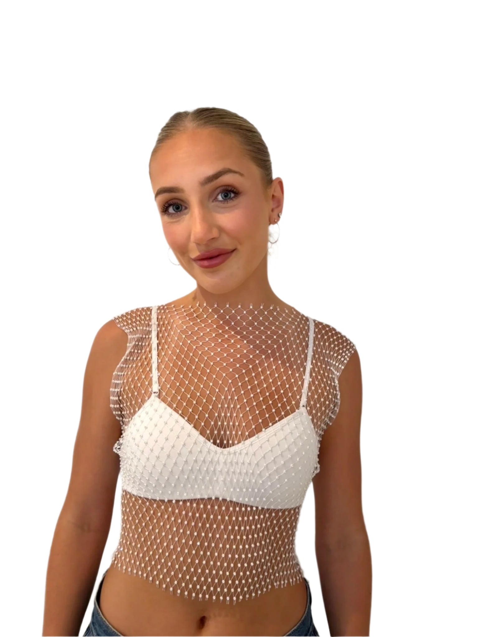 The Chrysler Rhinestone Top- White is a stylish and fashionable choice. Crafted with a white mesh material, it features delicate rhinestone detailing. This top is sure to turn heads as it sparkles under the lights.