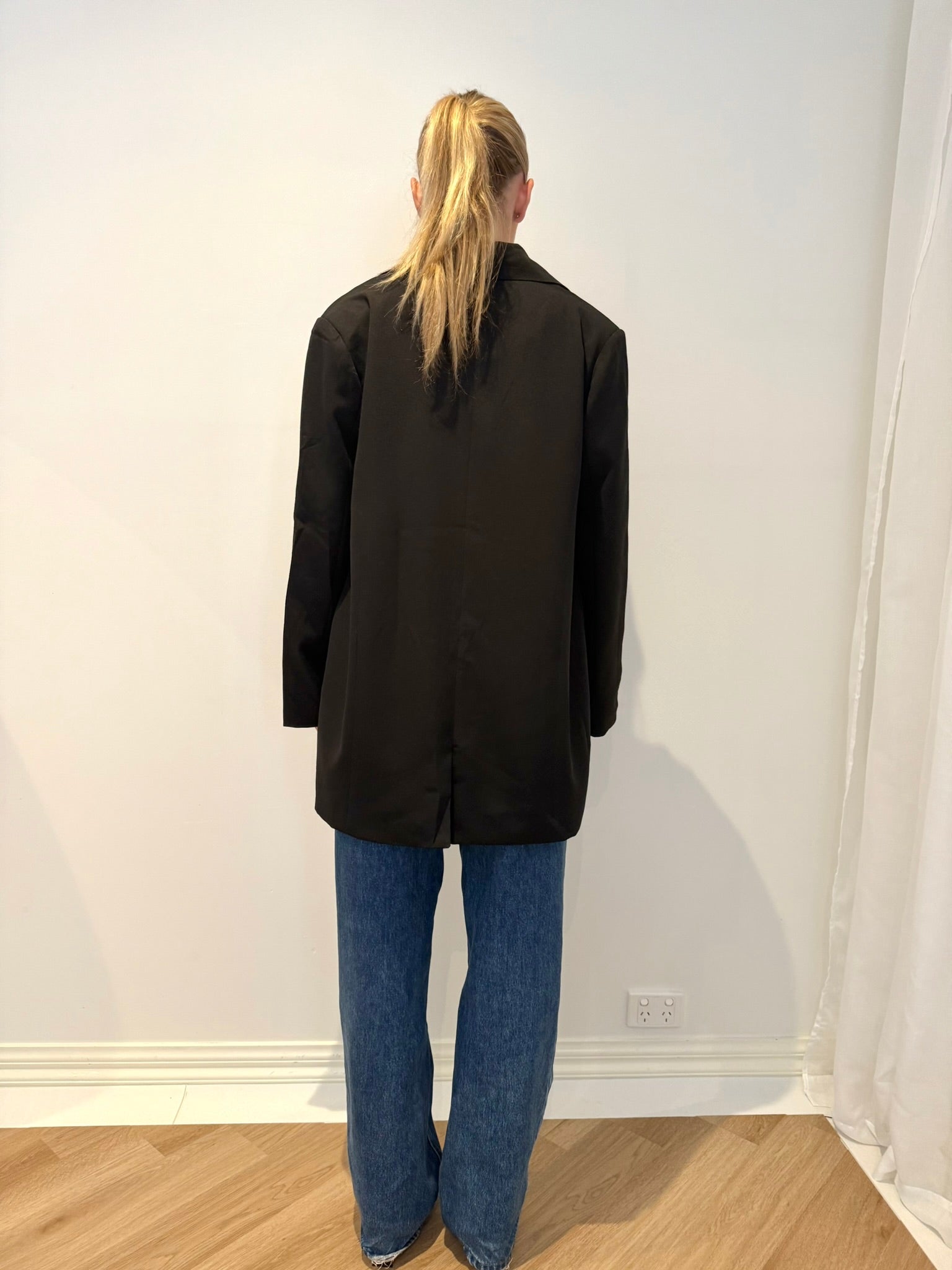 Elevate your wardrobe with the versatile and timeless Empire Oversize Blazer. Its black, stretch fabric and double-breasted design offer a stylish look with a comfortable and flattering fit. Perfect for layering, this blazer is a must-have addition to any outfit.